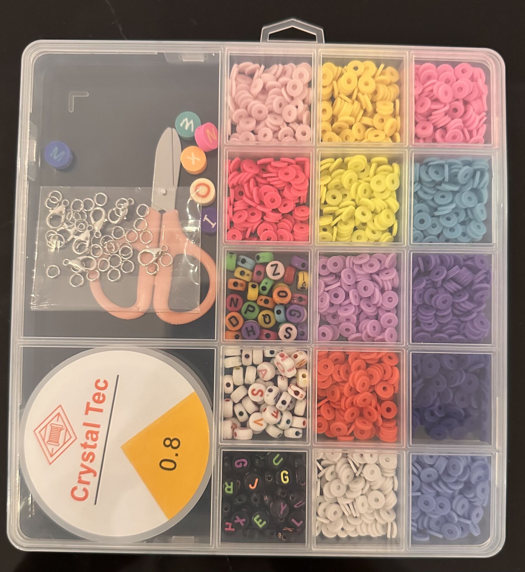 Set içerisinde farklı renklerde disk boncuklar, harfli boncuklar, takı aparatları, misina ip ve mini makas yer alır. Bölmeli şeffaf kutusu sayesinde boncuklar karışmadan düzenli şekilde saklanabilir.