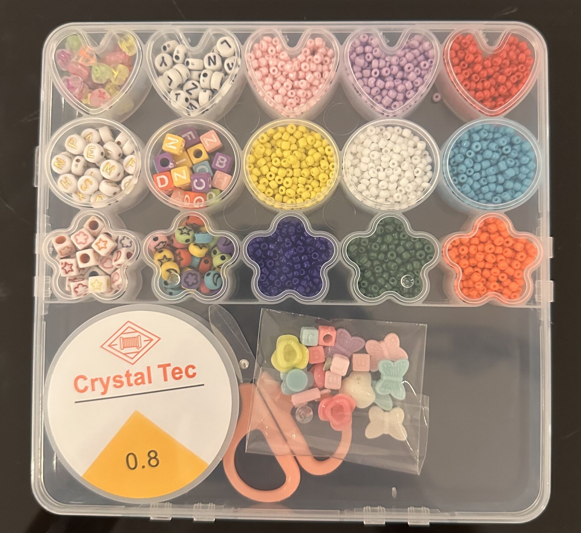 Set içerisinde farklı renk ve formlarda yuvarlak boncuklar, harf boncuklar, figürlü boncuklar, takı ipi, makas ve aksesuar parçaları yer alır.